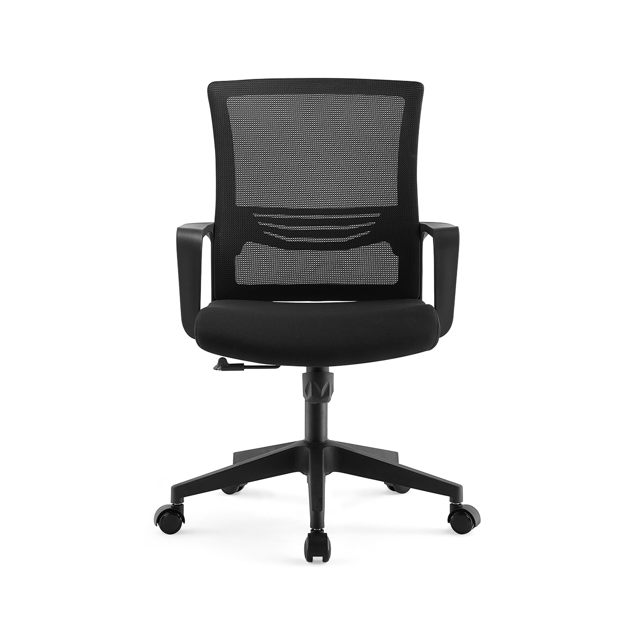 ERGONOMIC MEDIUM BACK CHAIR IN BLACK MESH BACK AND FABRIC UPHOLSTERED SEAT.