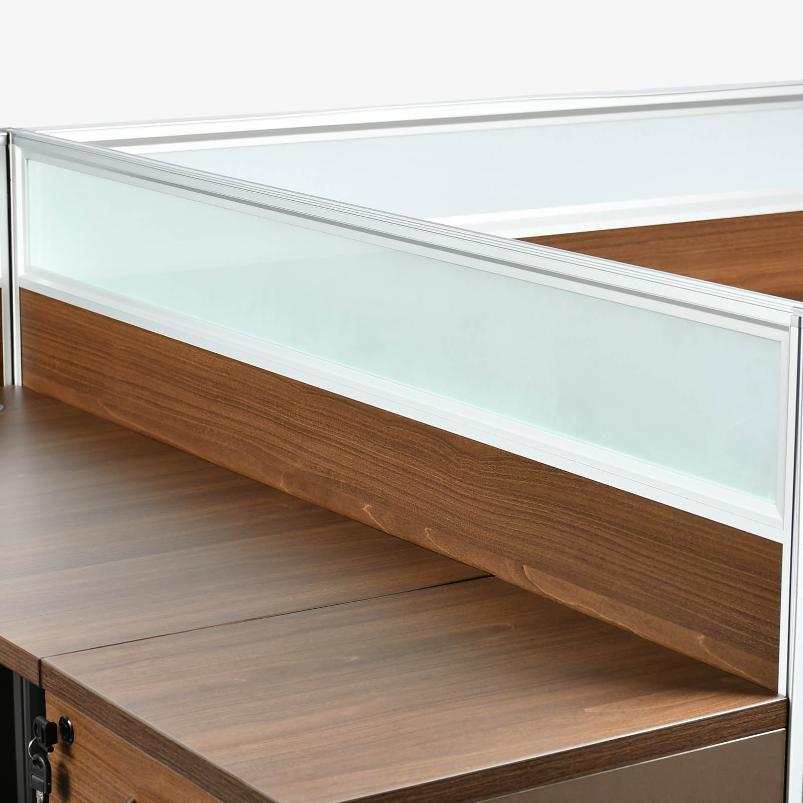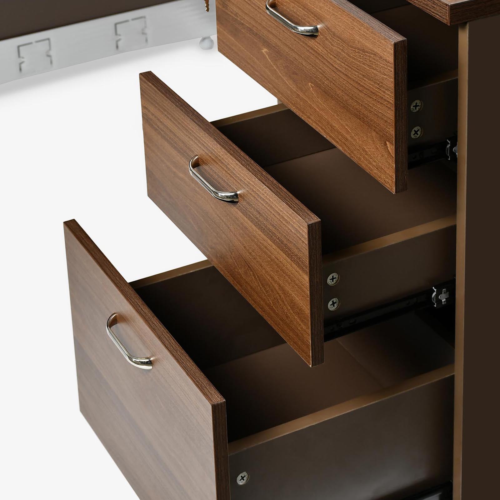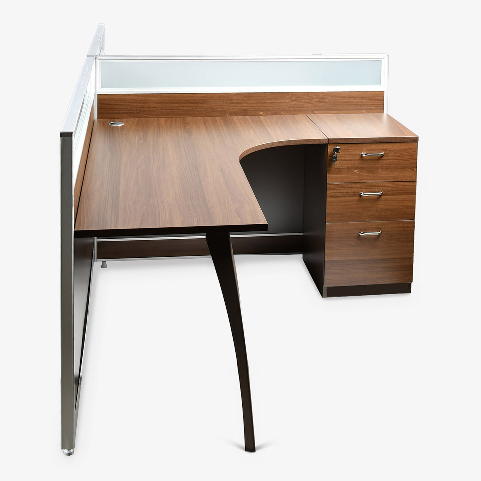 With metal leg and 3 drawer cabinet with lock. Finish – Melamine Color: Brown Oak + Brown.