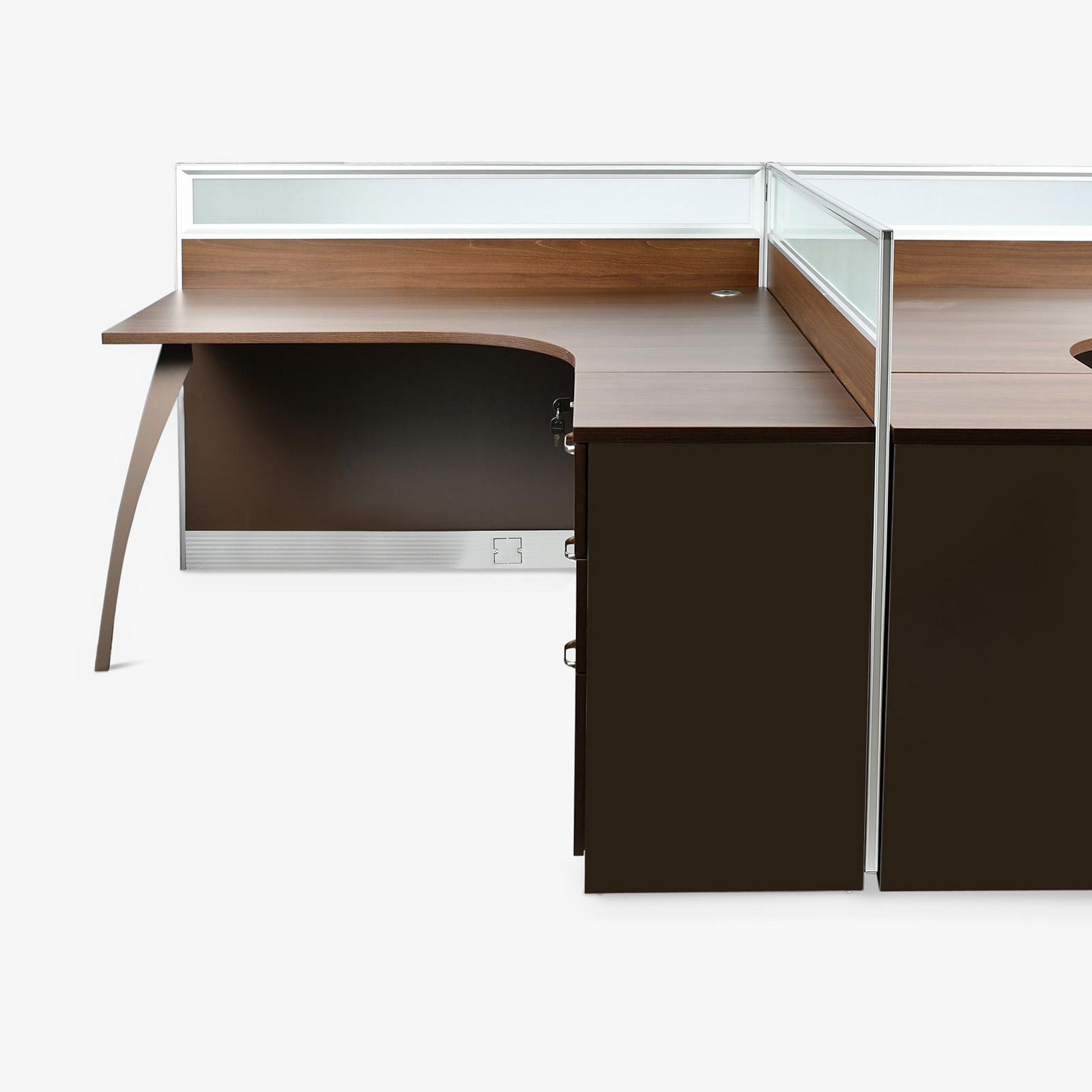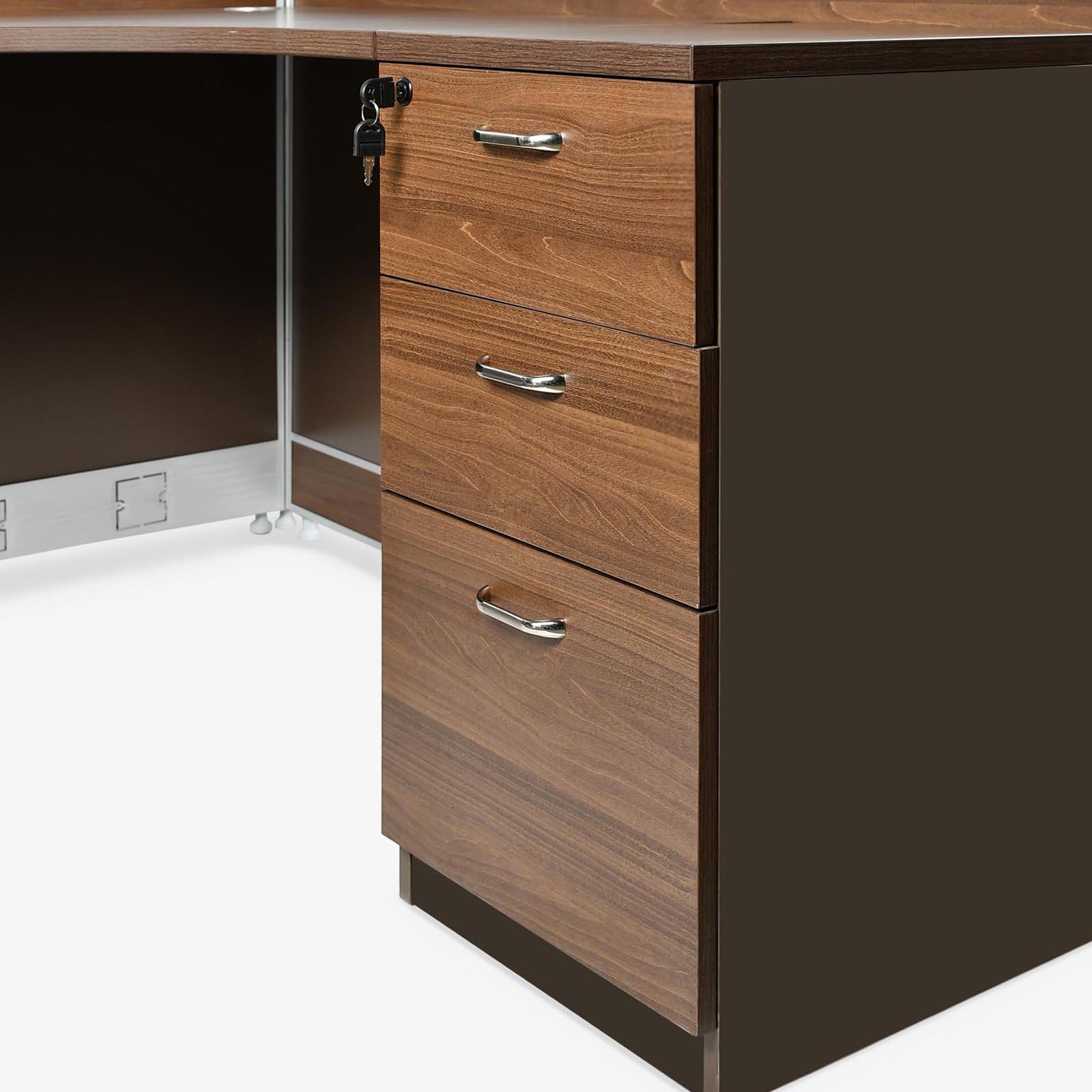 L-Shaped Single person Workstation – right oriented with metal leg and 3 drawer cabinet with lock. Finish – Melamine Color: Brown Oak + Brown.